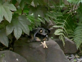 植え込みのところには、こんなお茶目なカエルさんの置物もあります。